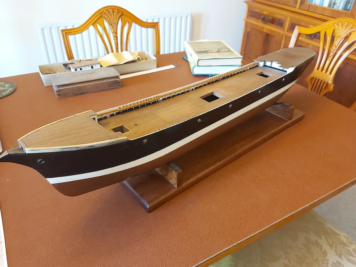 The model as received was a very substantial hull of bread-and-butter construction, about 33″ in length. No deck fitment or rigging was in place, although many of the spars and other fittings were collected in a box. No work had taken place on the model for years. It was a daunting challenge. Of interest was some fascinating correspondence between Simon’s father and Harold A Underhill, dating from 1935, regarding details of the ship.