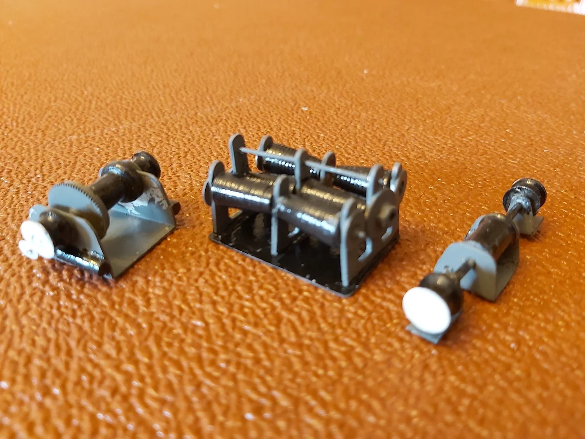 My Myford lathe came in useful in turning the tapered drums for these winches. The winch for the foremast yards is located just abaft the mainmast, in full view, while the mainmast winch is located under the poop deck, accessed from above by an open well, railed off. This winch could be simpler in construction, as it is barely visible on the model.