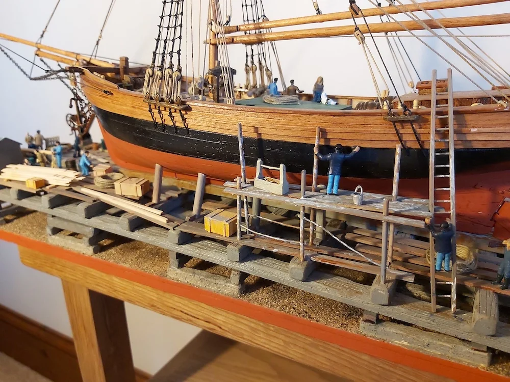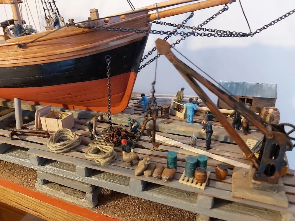 My enthusiasm whetted, my next project will be another shipyard. Two slipways, a coastal schooner under construction, in frame. A fishing smack under repair on the second slipway. Lots of interesting shipyard activity including a pitsaw, steambox and a mast being stepped. Workshops located “under the arches”, and a row of low-relief terraced houses adjacent.