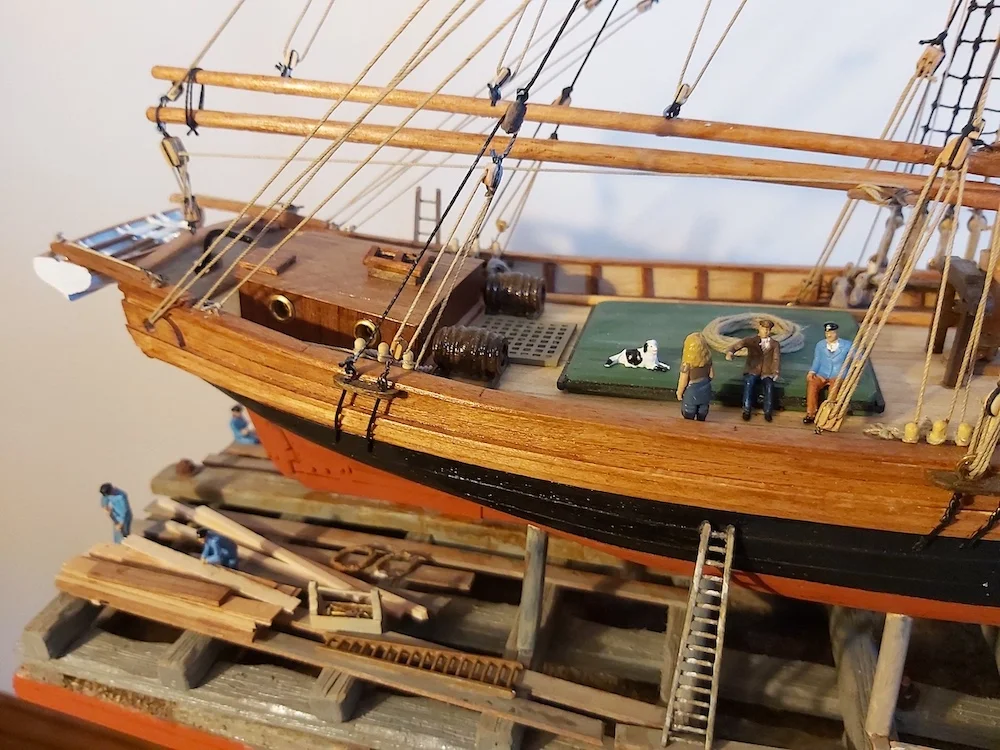 I actually decided early on to build the vessel as she appeared originally. Amundsen made a number of modifications which didn’t add to the ship’s appearance. When he added the engine, there was nowhere for a propeller, so an additional deadwood timber was added to the transom, with a propeller aperture. The rudder was hung on this false deadwood. This looks rather ugly, both in model form as well as in the real vessel, and I omitted it, converting her back to a pure sailing vessel.